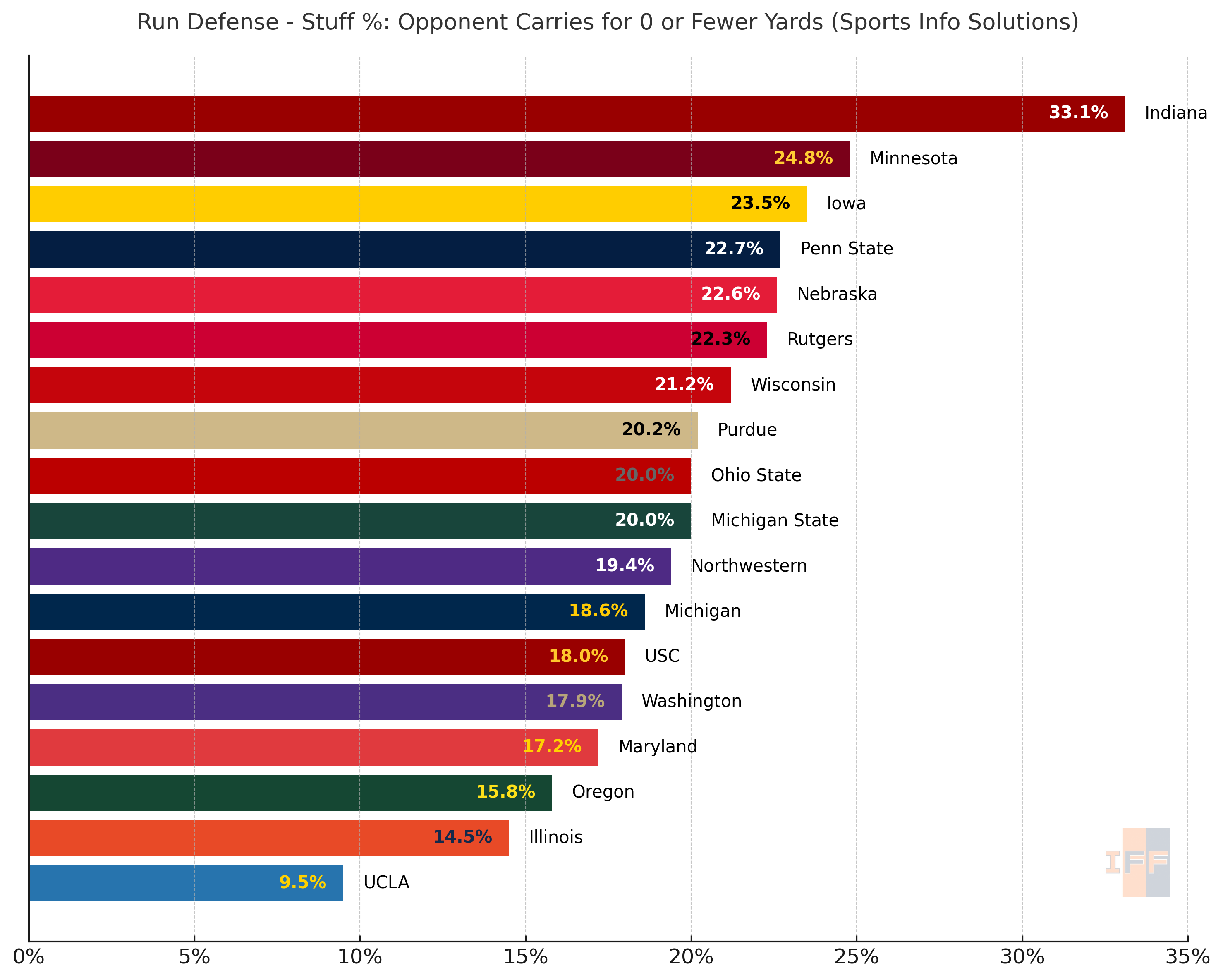 Stuffs are carries that result in zero or fewer yards, and Illinois’ defense has registered them on only 14.5% of opponent rushing attempts, the second-lowest rate in the Big Ten. Indiana, by comparison, leads the conference with an incredible 33.1% of opponent runs going for no gain or a loss.
