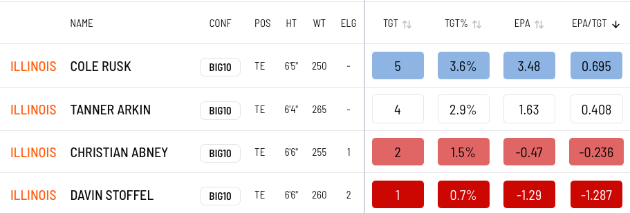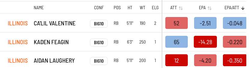 The Hank Beatty YAC numbers came from there. And since we’ve talked so much about EPA in this post, it’s a good time to look at how Illinois players stack up by position group in that metric.