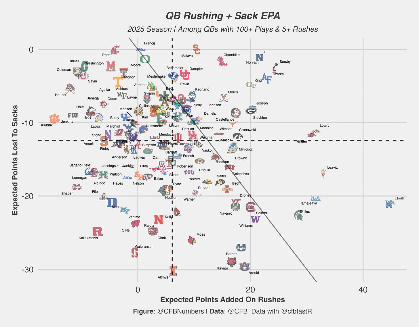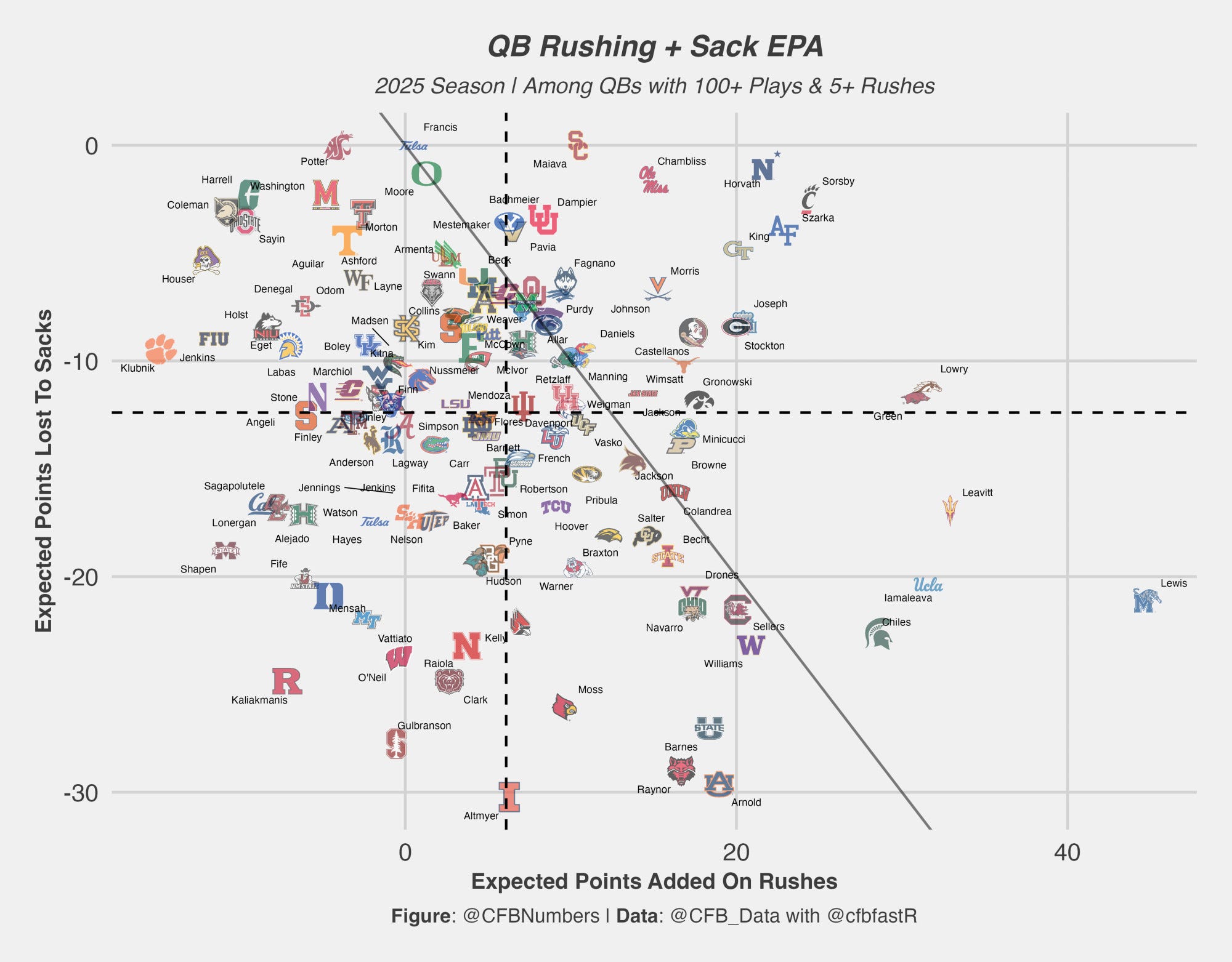 While this chart also includes quarterback rushing, the focus here is on the sack portion. The vertical axis shows expected points lost to sacks, the higher a player is, the fewer sacks they’ve taken and the less they’ve hurt their offense. The lower you go, the more frequent and costly the sacks have been.