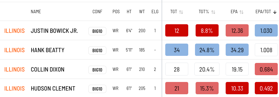 If we lower the minimum target threshold to 12 to capture all of Illinois’ primary receivers, here’s how they stack up among Big Ten wideouts in EPA per target: