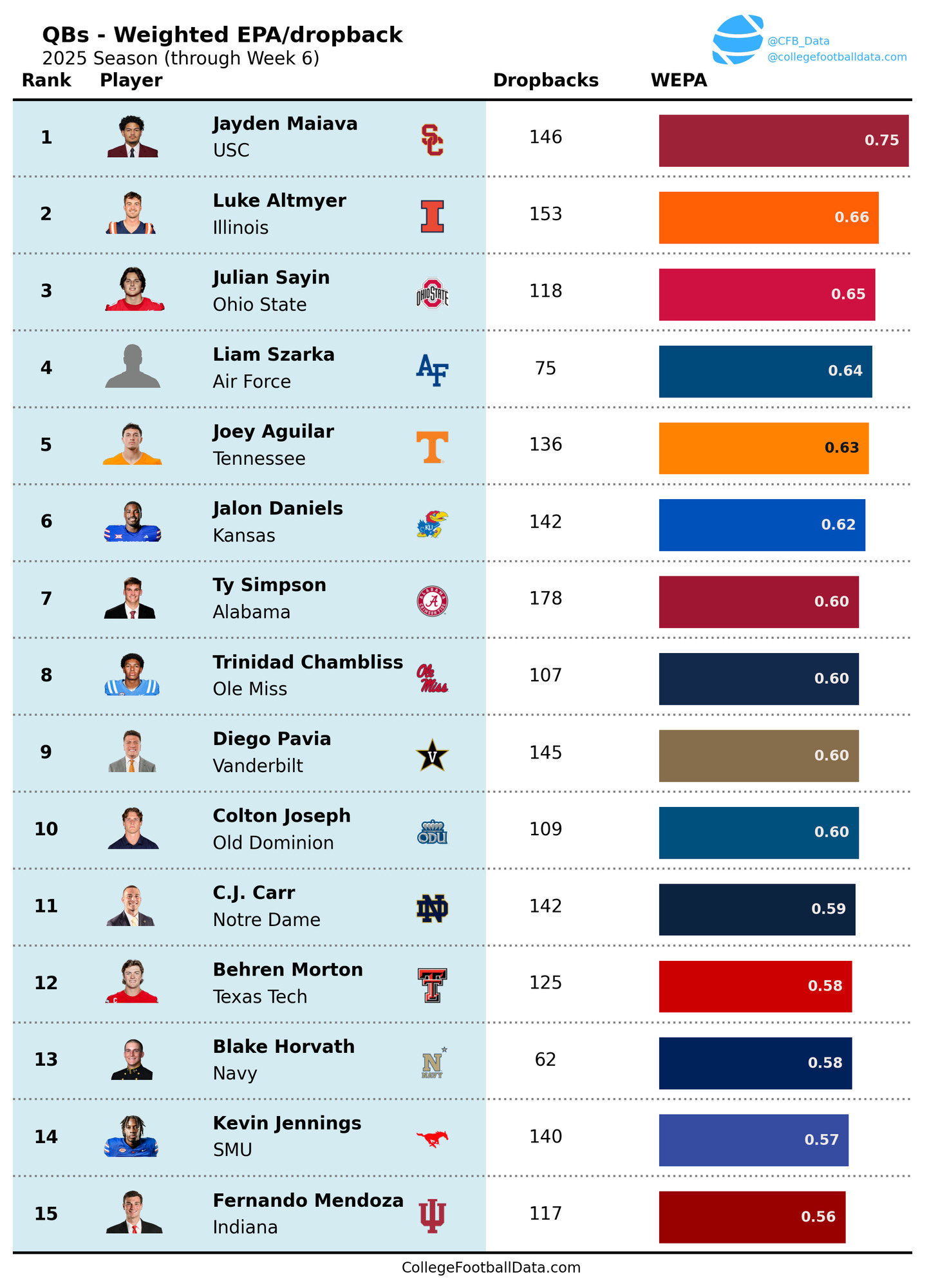 On a more analytical level, we turn to Weighted EPA per Dropback. For every play, we know the ball’s location, the down and distance, and the time remaining in the quarter. With that information, we can calculate the probability of scoring and determine how many expected points a team has in that specific situation.
