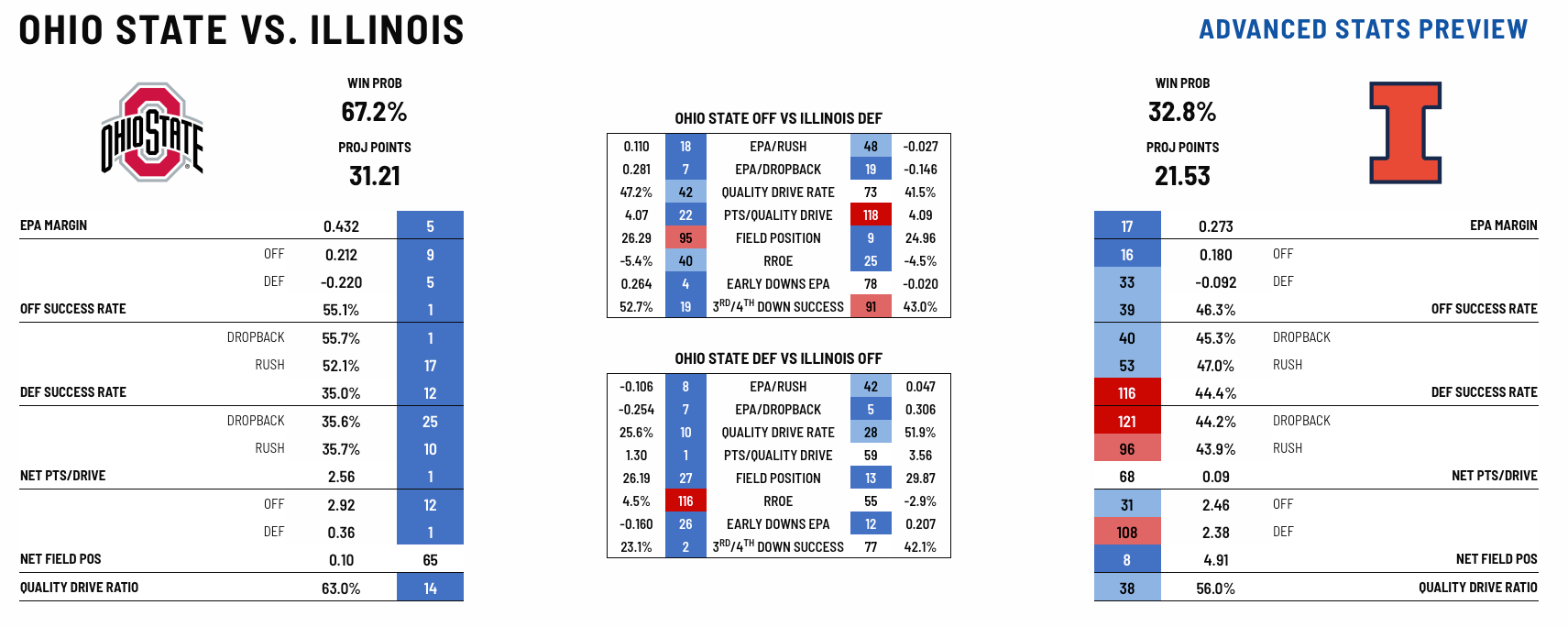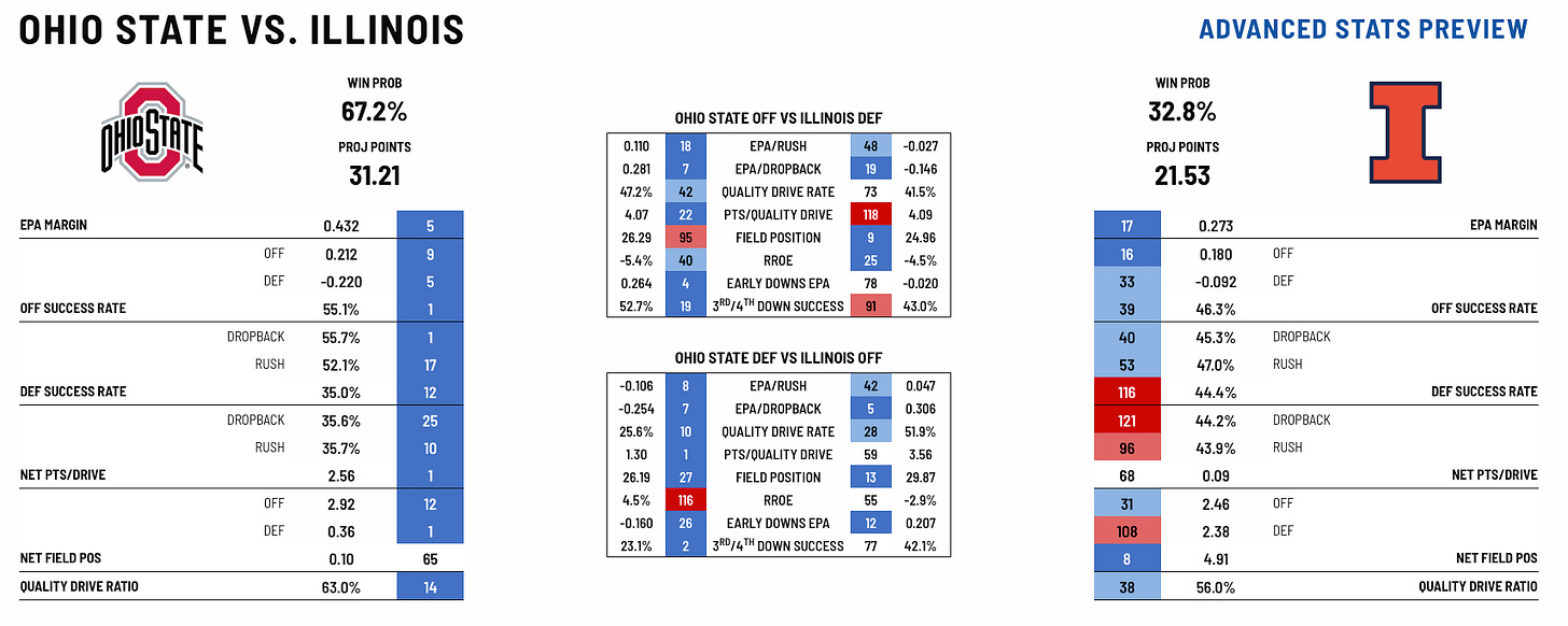 Illinois does hold one slight advantage: the passing game. The Illini rank fifth nationally in EPA per dropback, compared to Ohio State’s seventh. Still, this matchup is a long shot.